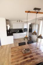 Das Ferienhaus ist vollständig eingezäunt. Heller Eingangsbereich und ein geräumiger Wohn- und Essbereich mit angrenzender moderner Küche.