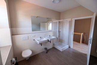 Badezimmer mit Doppelwaschtisch, Dusche und Wanne